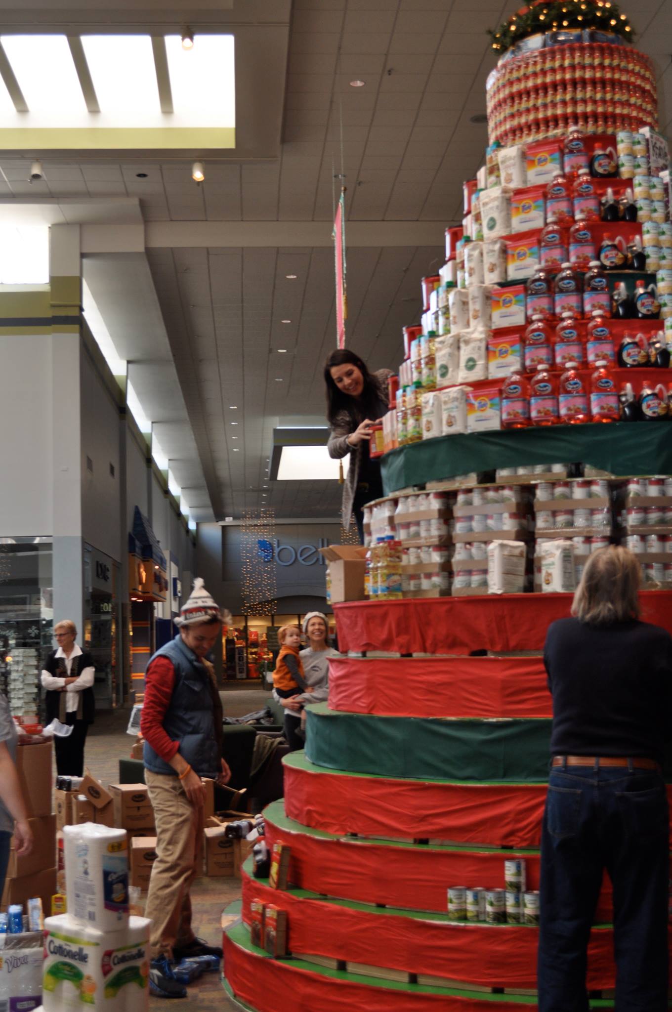 The Ingles Giving Tree is made of food, right down to the core, with ten tons of non-perishable food items donated by Ingles Markets. The tree is constructed and decorated by MANNA staff and volunteers in a marathon effort that takes place the weekend before Thanksgiving. Sally Spiegel, an Asheville area Designer and Project Manager, plans out the final look of tree. Last year’s design featured cascading “ribbons” of juice, paper towels, canned vegetables and cereal topped off with hundreds of spice jars.