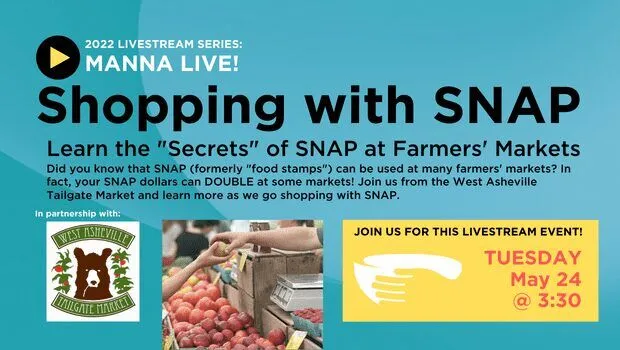 MANNA LIVE! On May 24th, we will be hosting our next “MANNA Live!” live stream event, Shopping with SNAP. The live stream will take place at the West Asheville Tailgate Market and will highlight the benefits of the Double SNAP program. Shopping with SNAP will take place from 3:30-4:00 PM on Tuesday, May 24th. The……